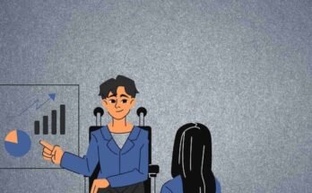 thee is a man sitting on a chair and pointing towards growing chart and explaining the girl how to grow business with AI SEO tools